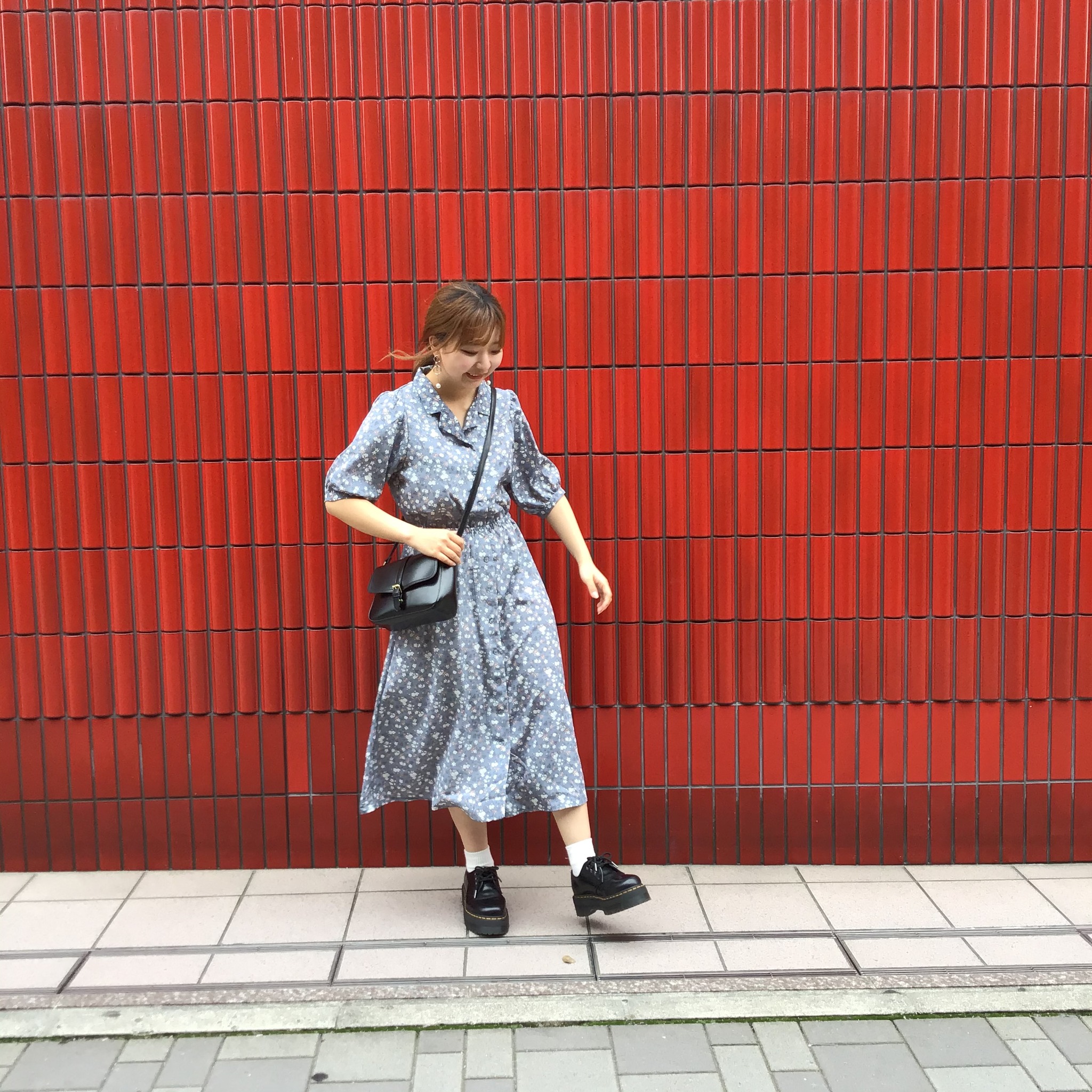 小花柄の開襟ワンピースです。袖の長さも5分くらいなので二の腕が隠れて露出が苦手な方でも着やすいデザインになってます。