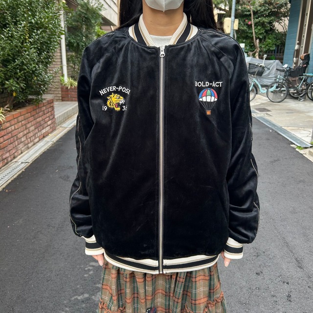 定番のトラ刺繍のスカジャンです。 表はベロアになっていて裏地はキルティングになっています。スッキリ着れるシルエットでとてもカッコいいです。メンズ着用可能ですよ。 スタッフ身長:152㎝ ※カラーは向かって左から順番です。 ※配送方法の宅急便コンパクトはレターパックプラスになります。 ⚠︎ 2点以上お買い上げの場合 配送方法は“ゆうパック/エコ配”を選択して下さい。 それ以外の配送方法を選択されますと、ご注文をお受け出来ないことがございます。 着丈:65㎝ 裄丈:77㎝ 身幅:126㎝ 【表地・裏地・刺繍糸】 ポリエステル 100% 【リブ部分】ポリエステル 97% ポリウレタン 3% ■注意点 ・できるだけ実物の色がでるように撮影しておりますが、 照明の色などにより色の見え方が異なる場合がございます。 ・サイズは平置きでの実寸を測っておりますので多少の誤差が生じる場合がございます。 ・開封時に臭いがすることがありますが、染料や素材の臭いですので品質に問題はありません。 ■在庫表示について 在庫状況は店舗との合計数量を表示しておりますのであくまでも目安となっております。 ネット上で「在庫あり」となっていても実際にご注文時において在庫切れとなっている場合がございます。 予めご了承ください。 なお、在庫切れの場合はメールまたは電話にてご連絡いたします。