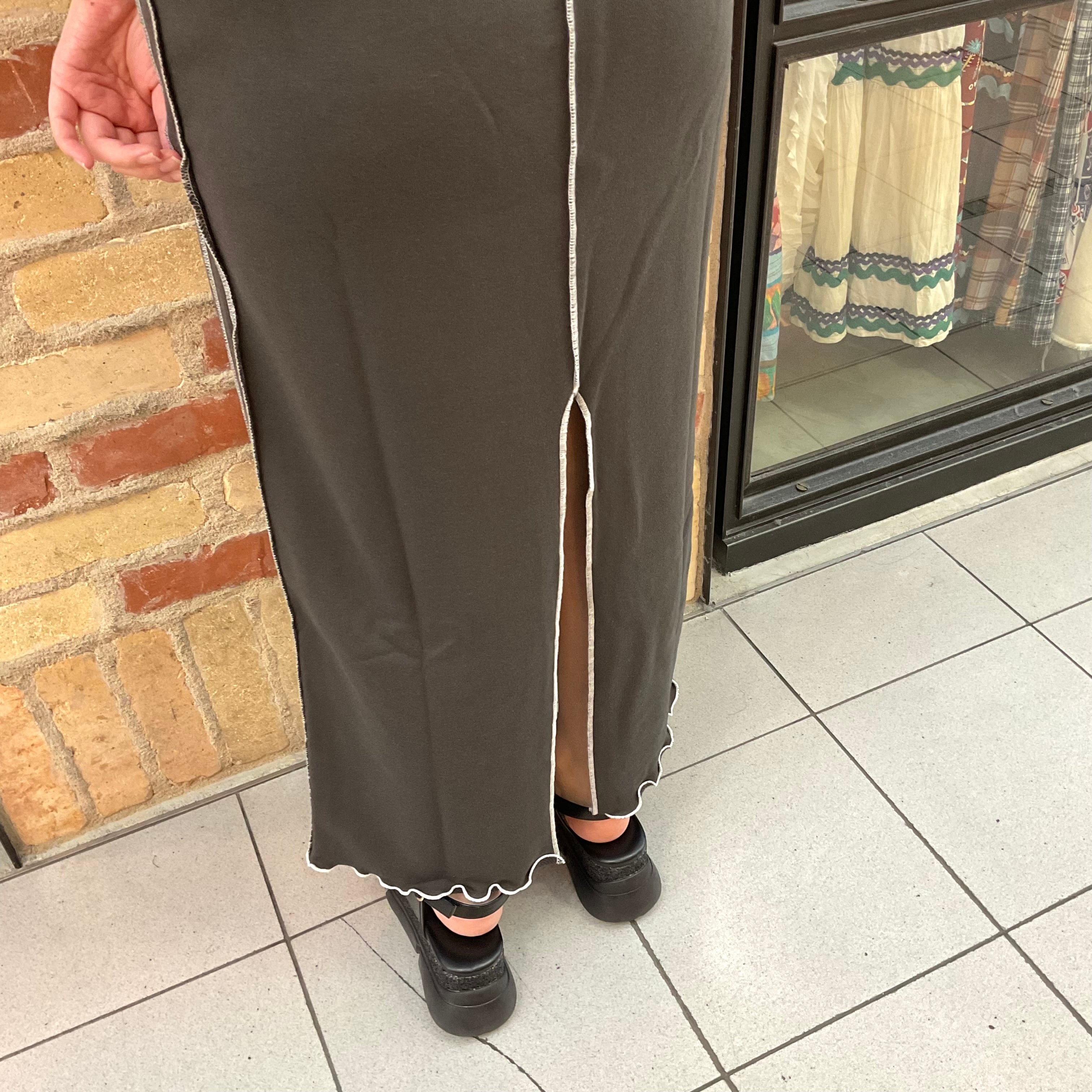 ウエスト総ゴム&後ろには深めのスリットが入っていて