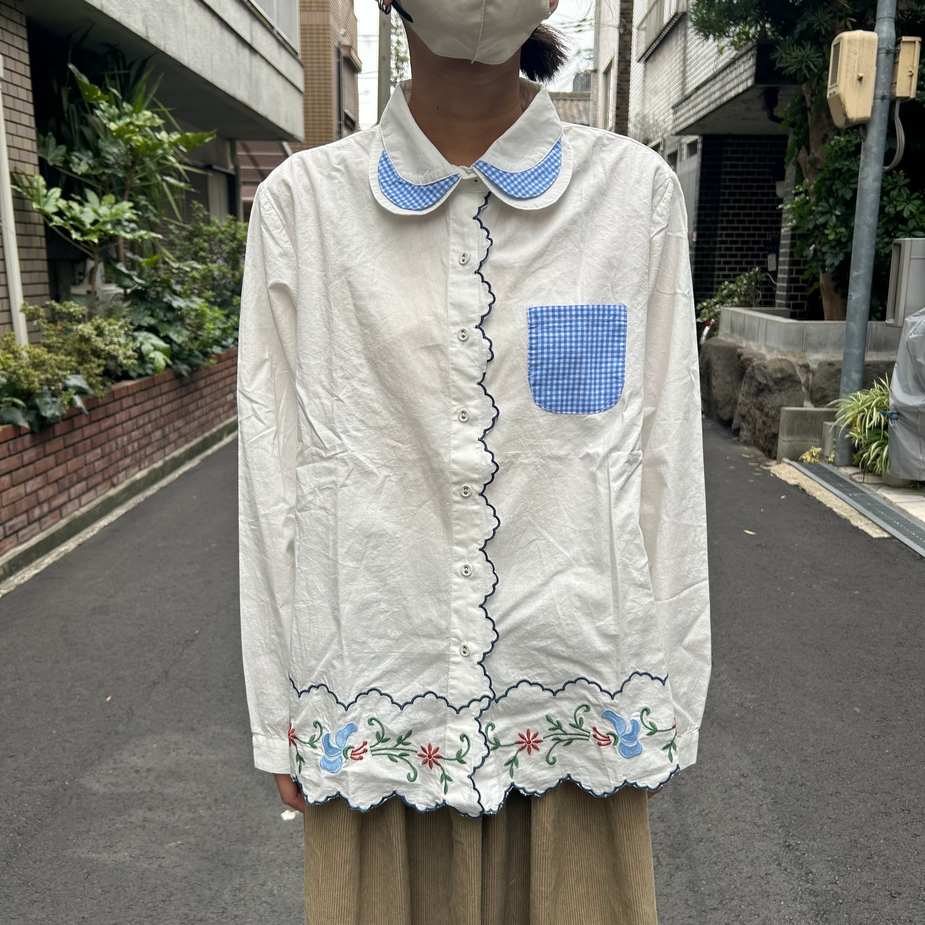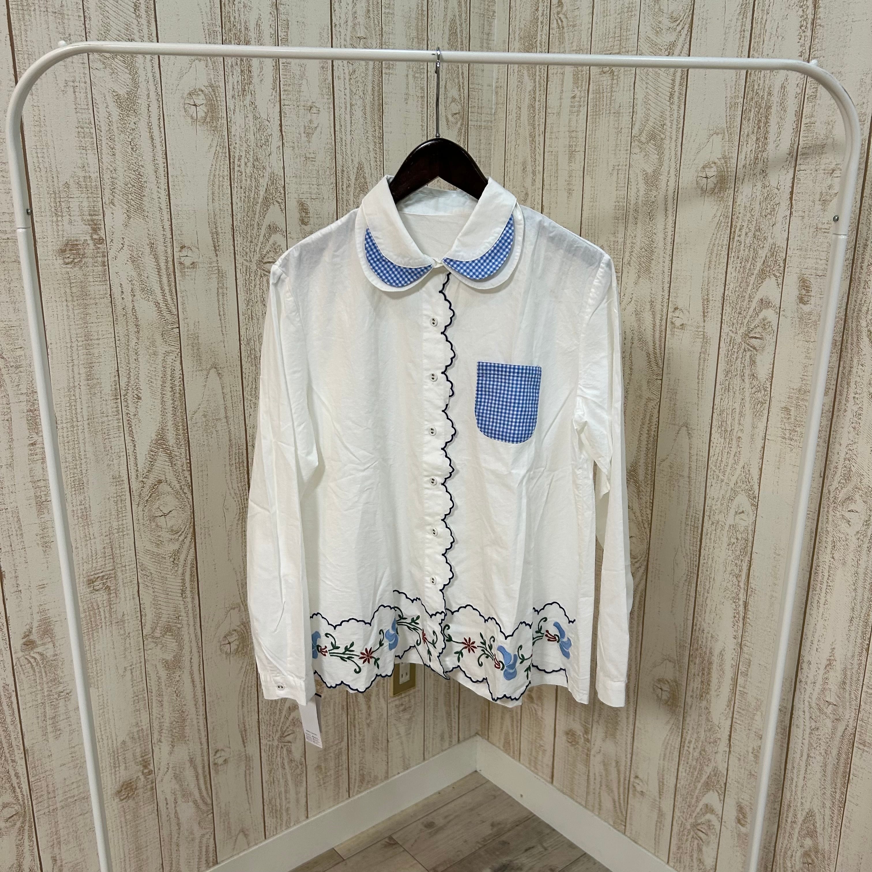 裾の花柄刺繍、ギンガムチェックのポケットと二重になってる襟元が目を惹きます❤︎