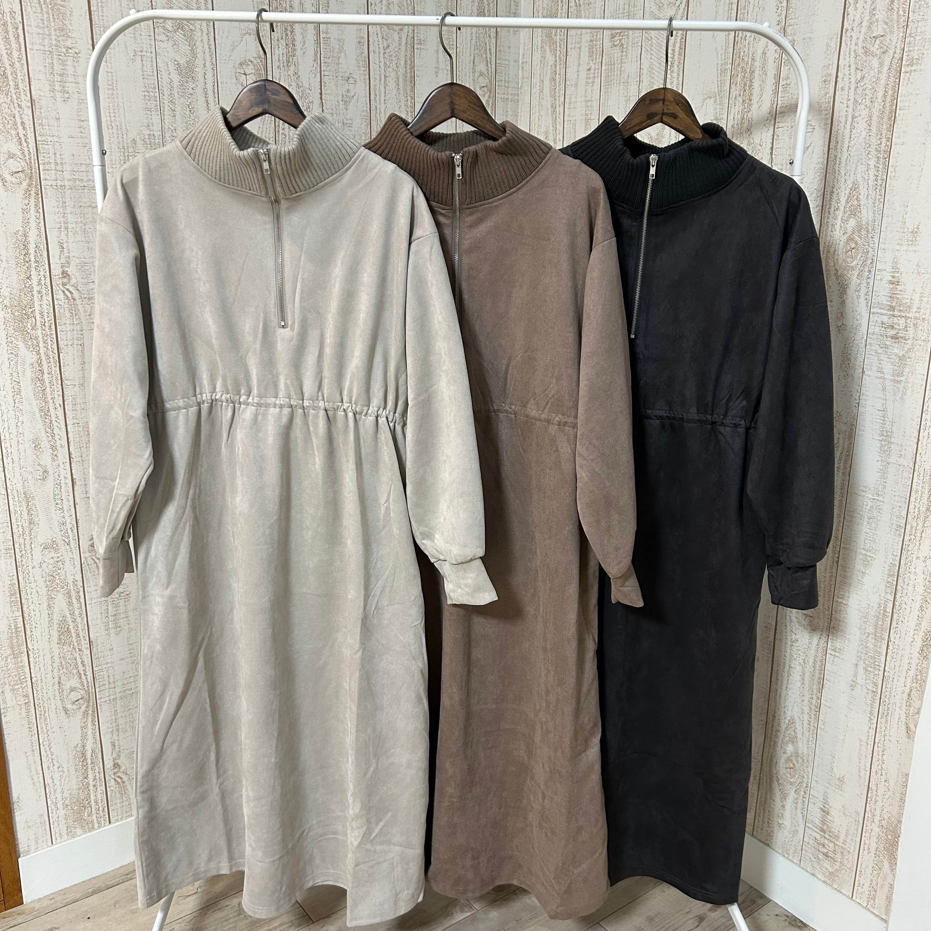 柔らかいスエード素材のハーフジップのワンピースです。インナーにタートルやハイネックを組み合わせても可愛いです。