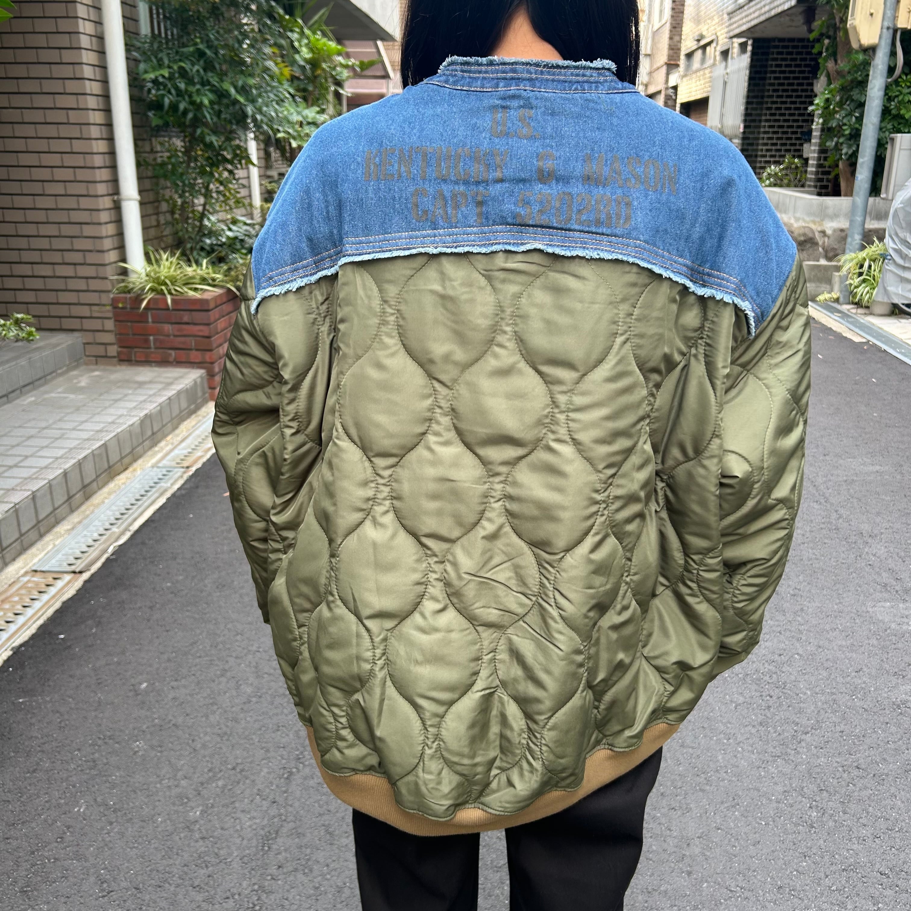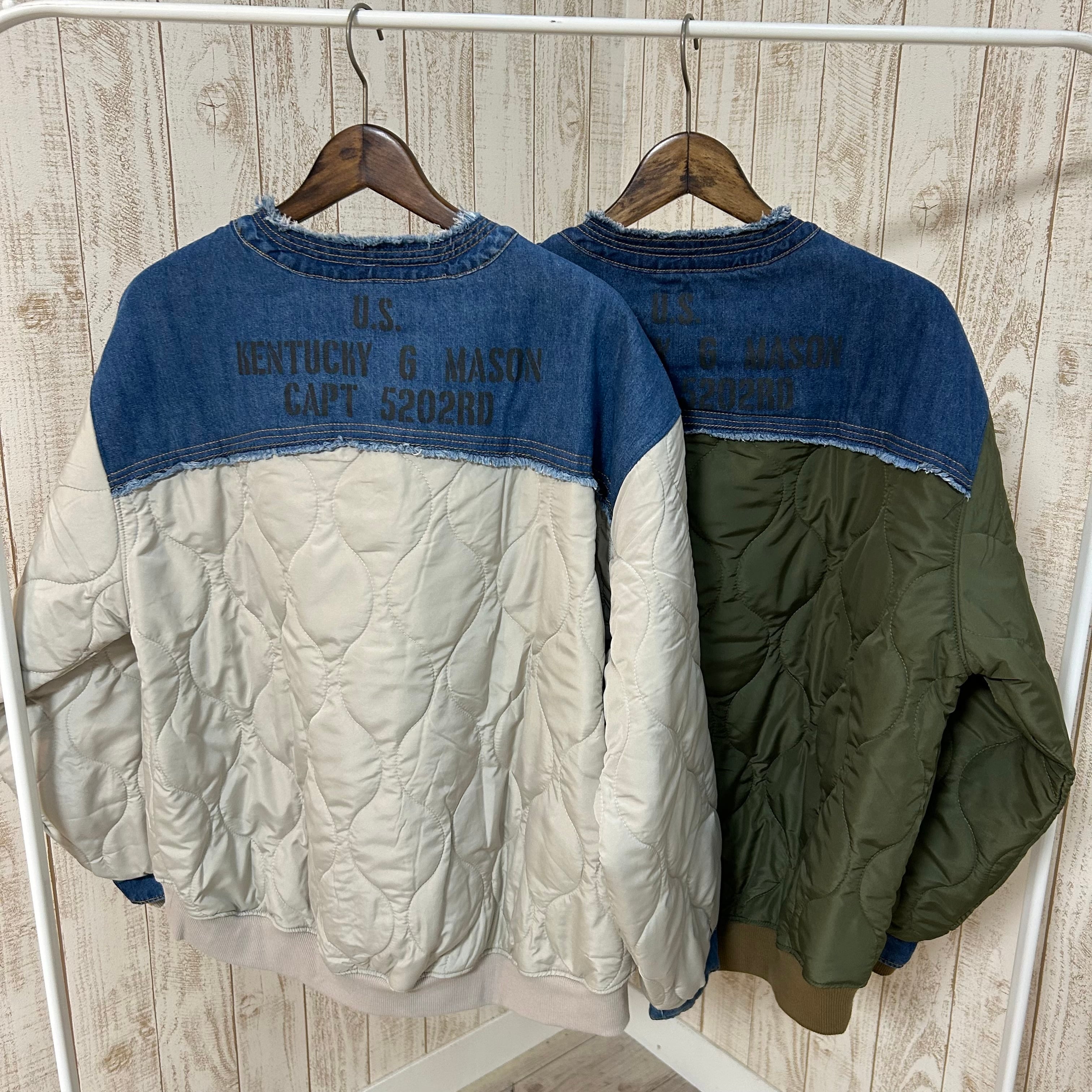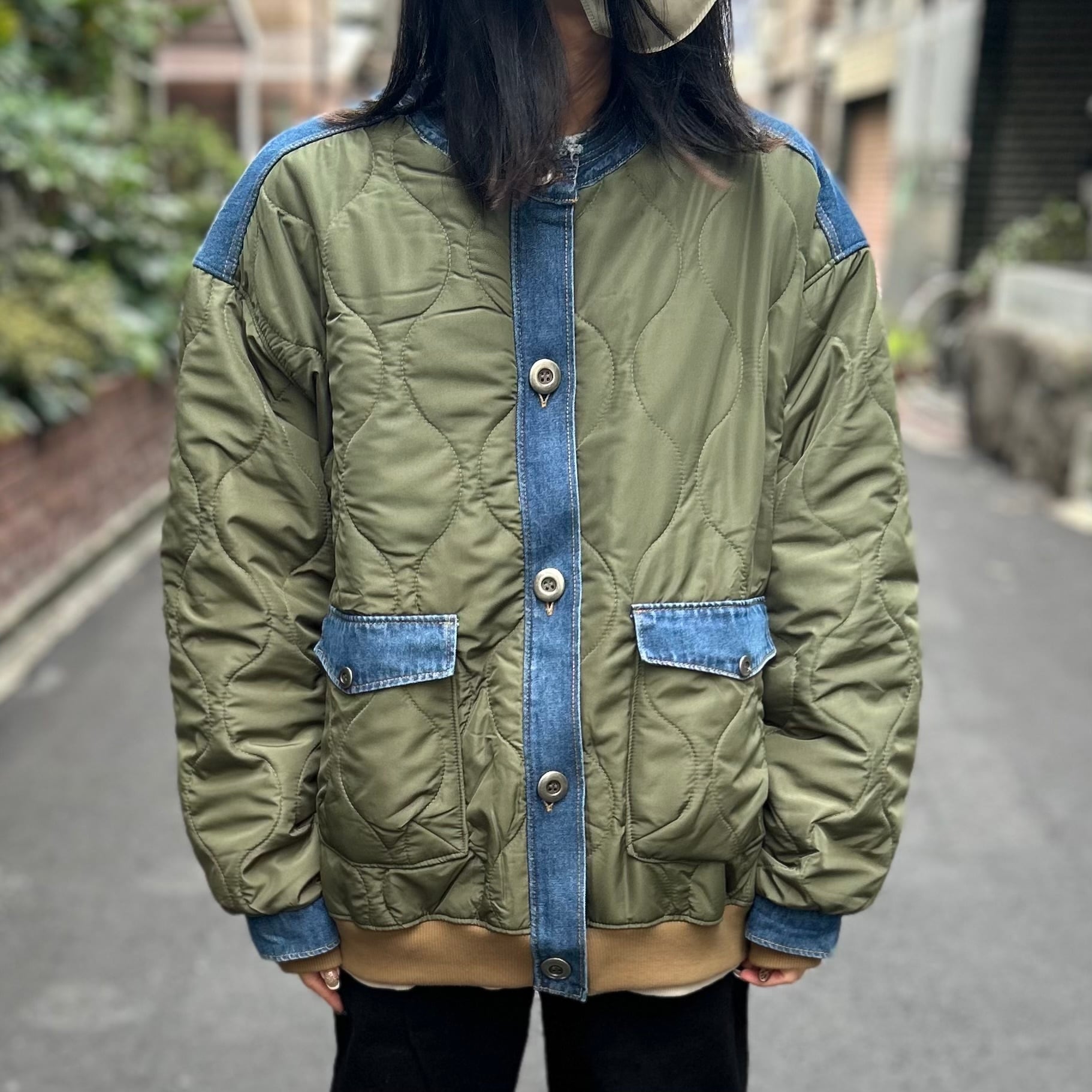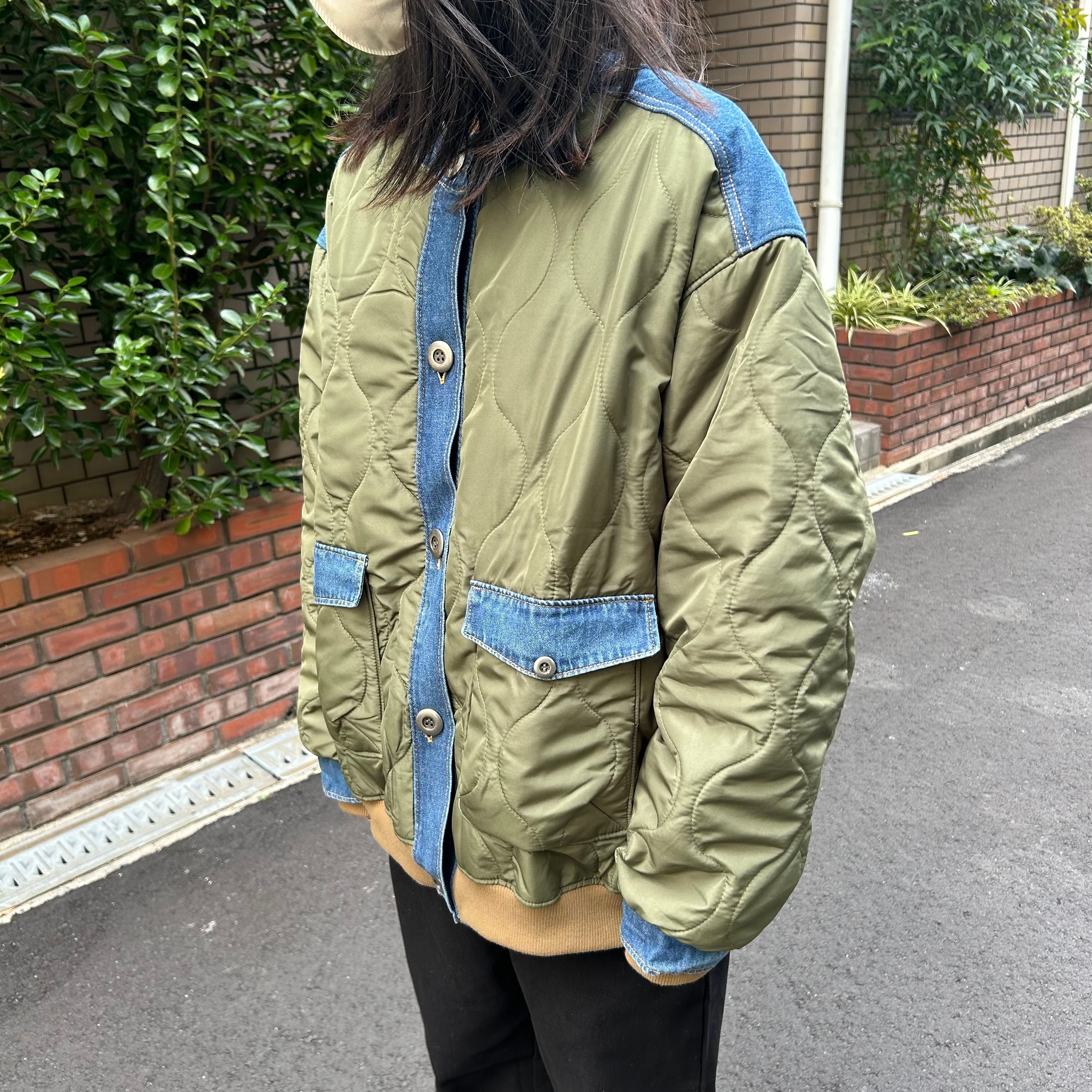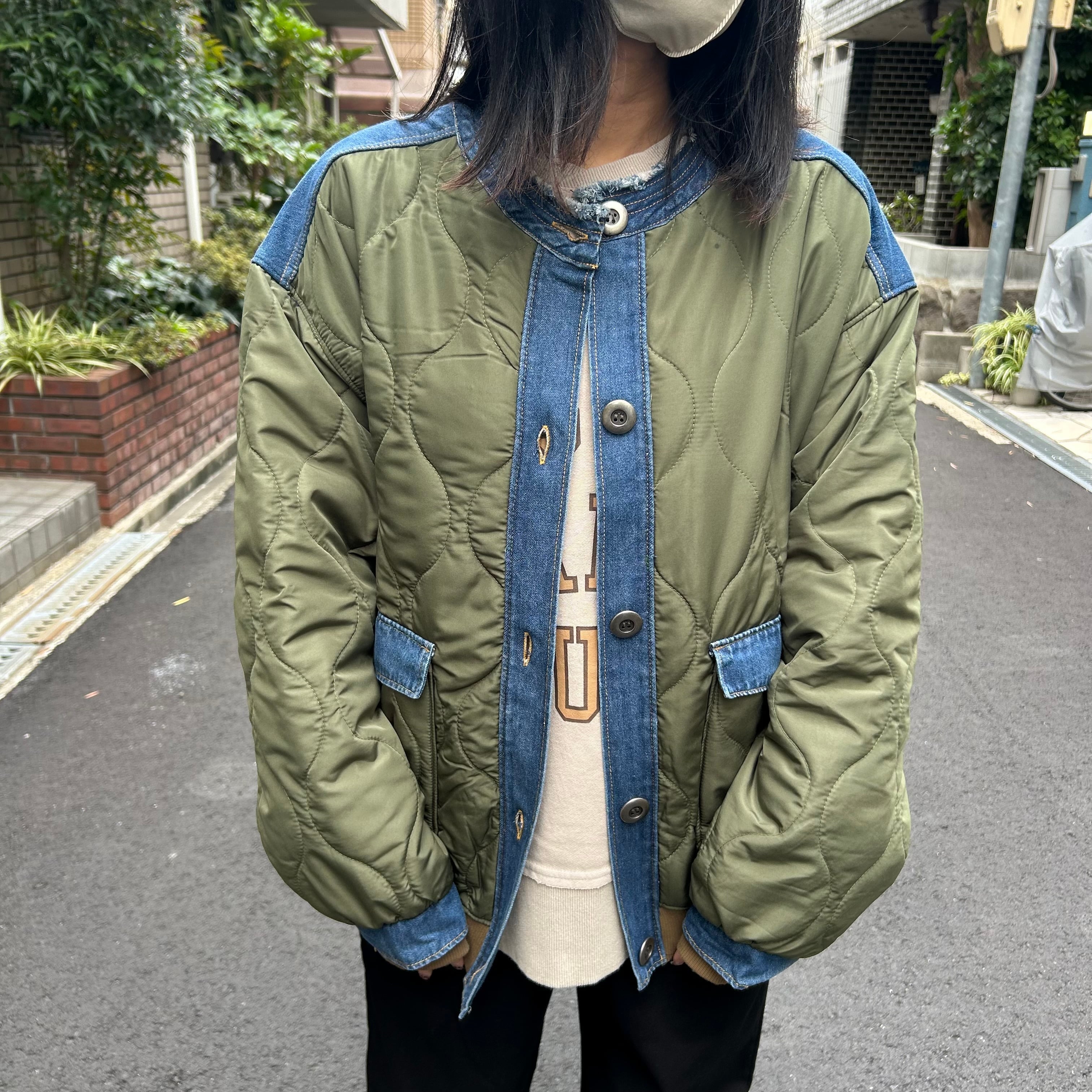 デニムとキルティングこリメイクジャケットです。古着風の味のある雰囲気で可愛いですよ。