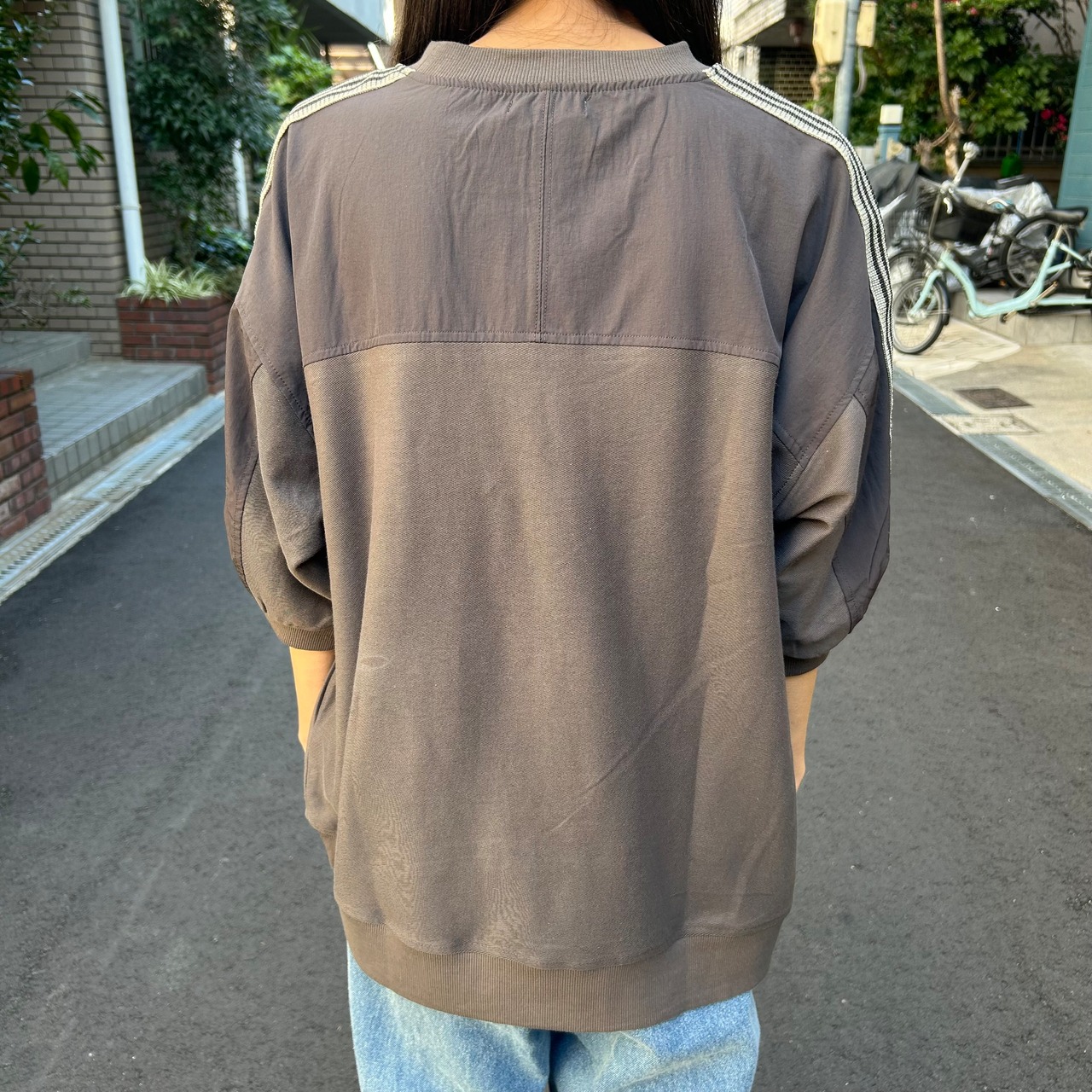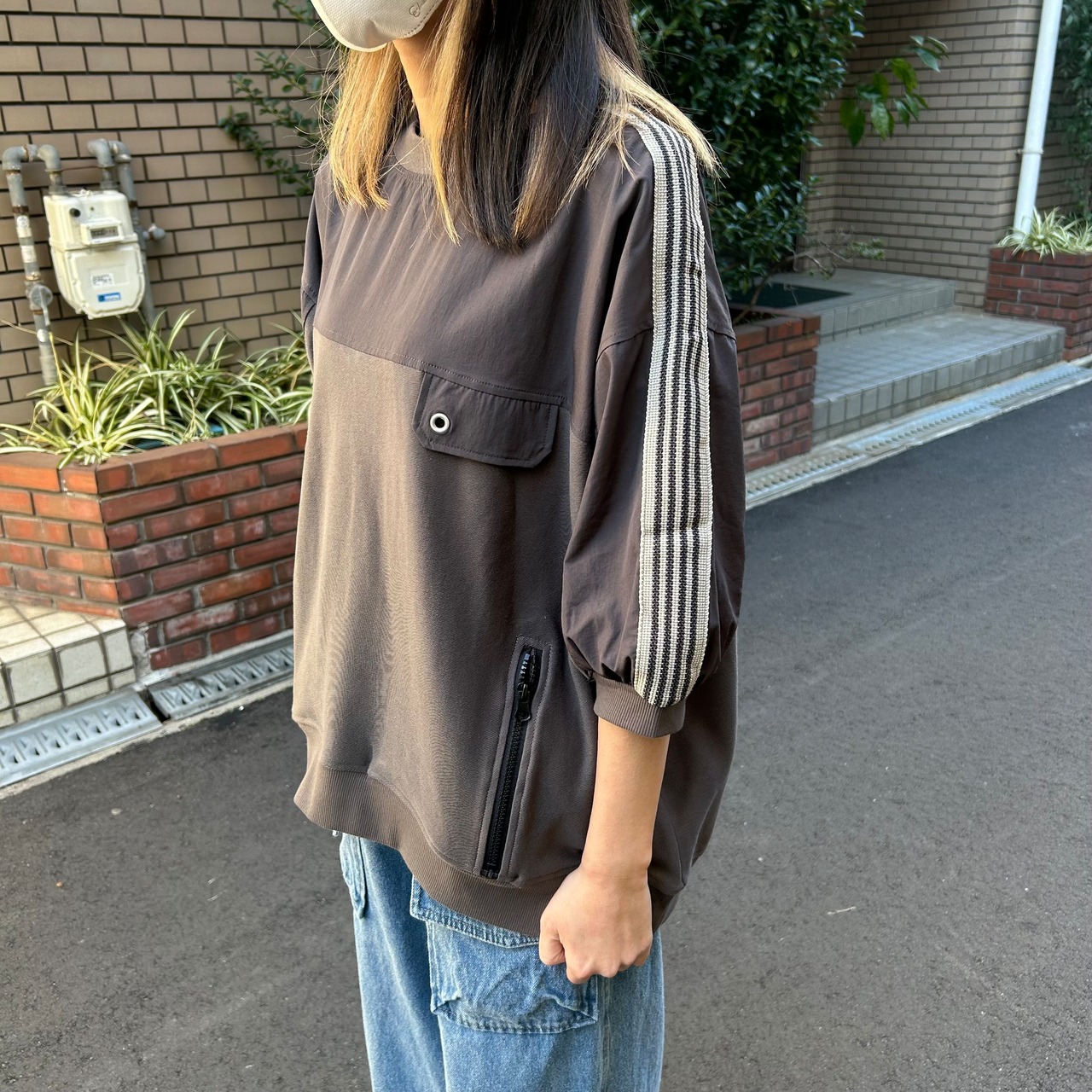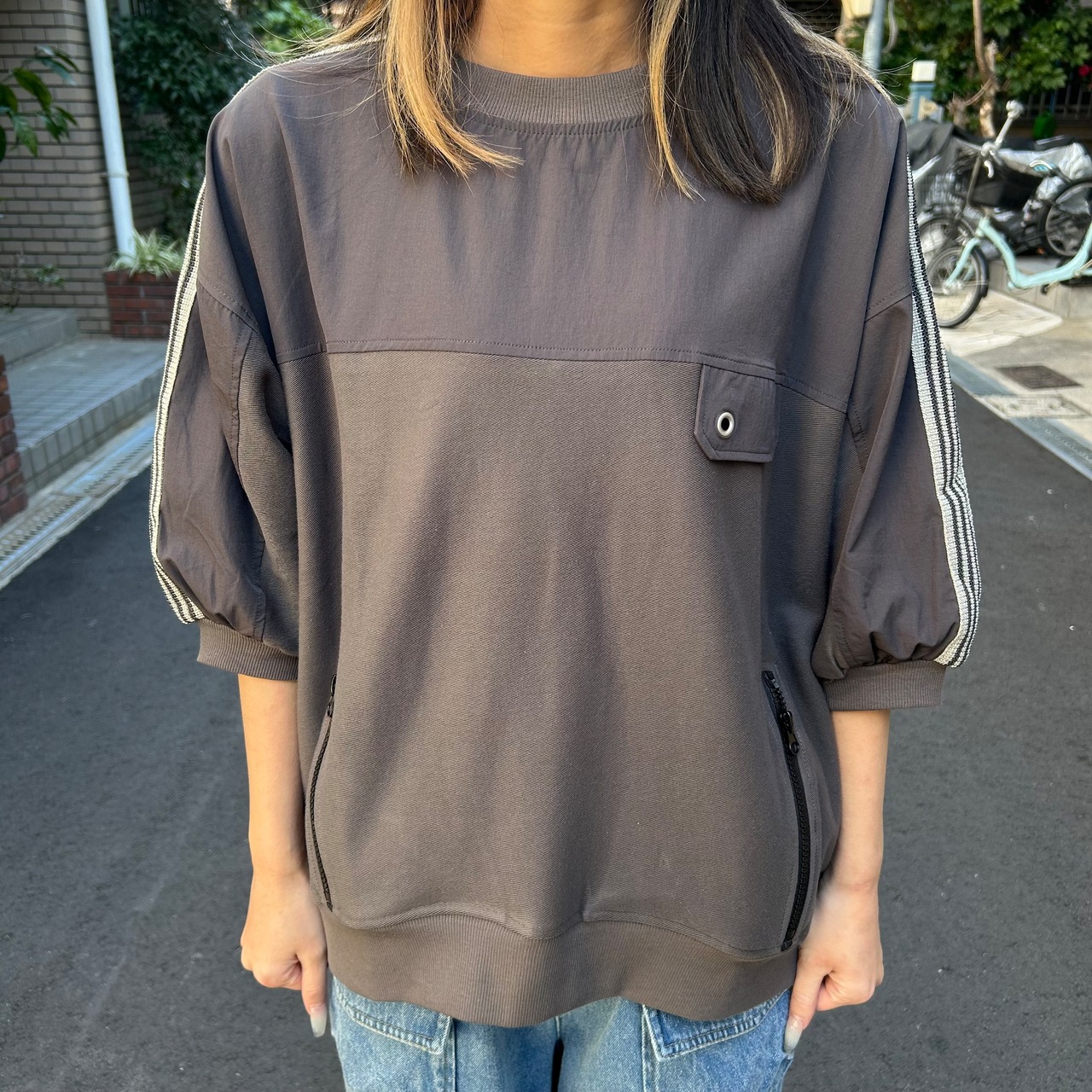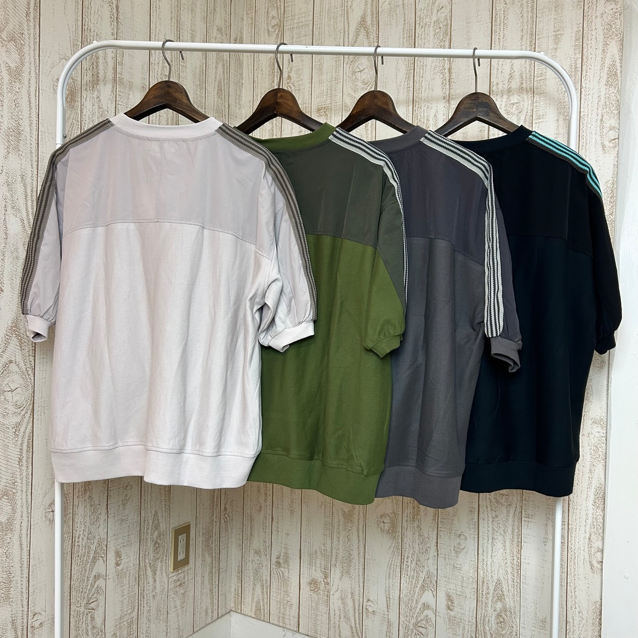 昨年から引き続き人気のライン入りのトップスです。1枚で着るだけで様になるのがいいですね。