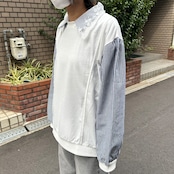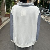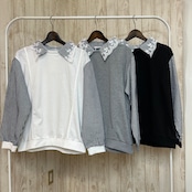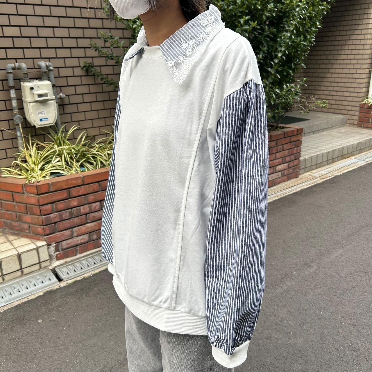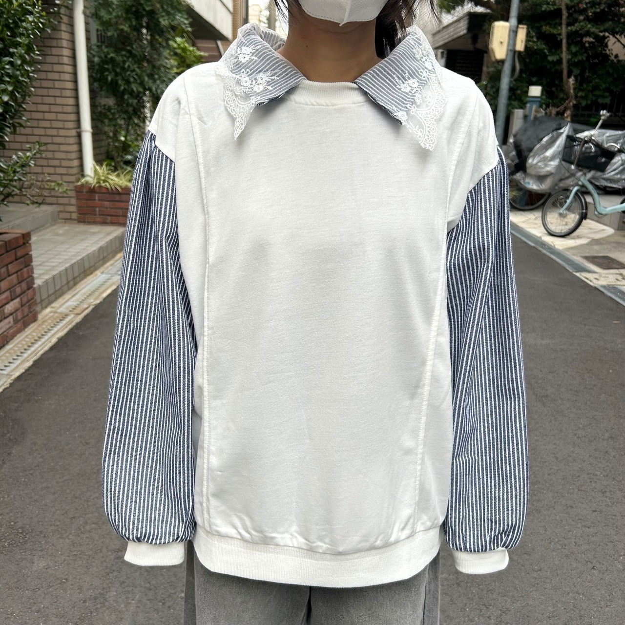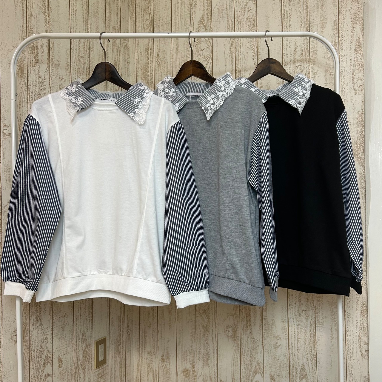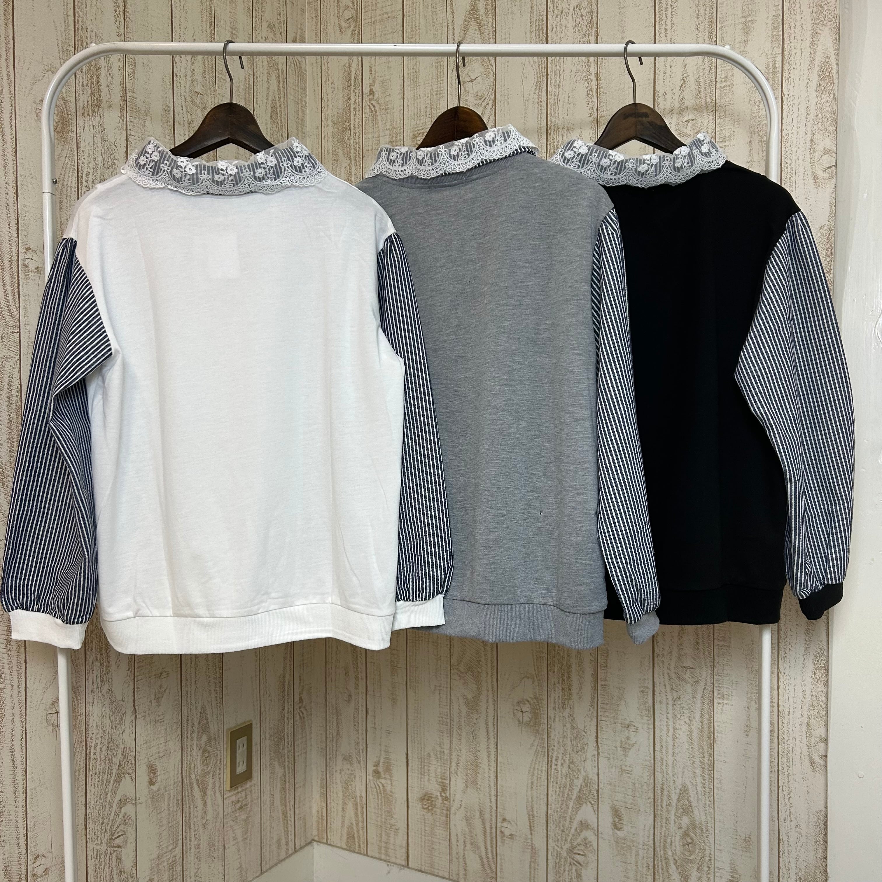 :レース衿ヒッコリー切替トップス(AN-0483)