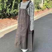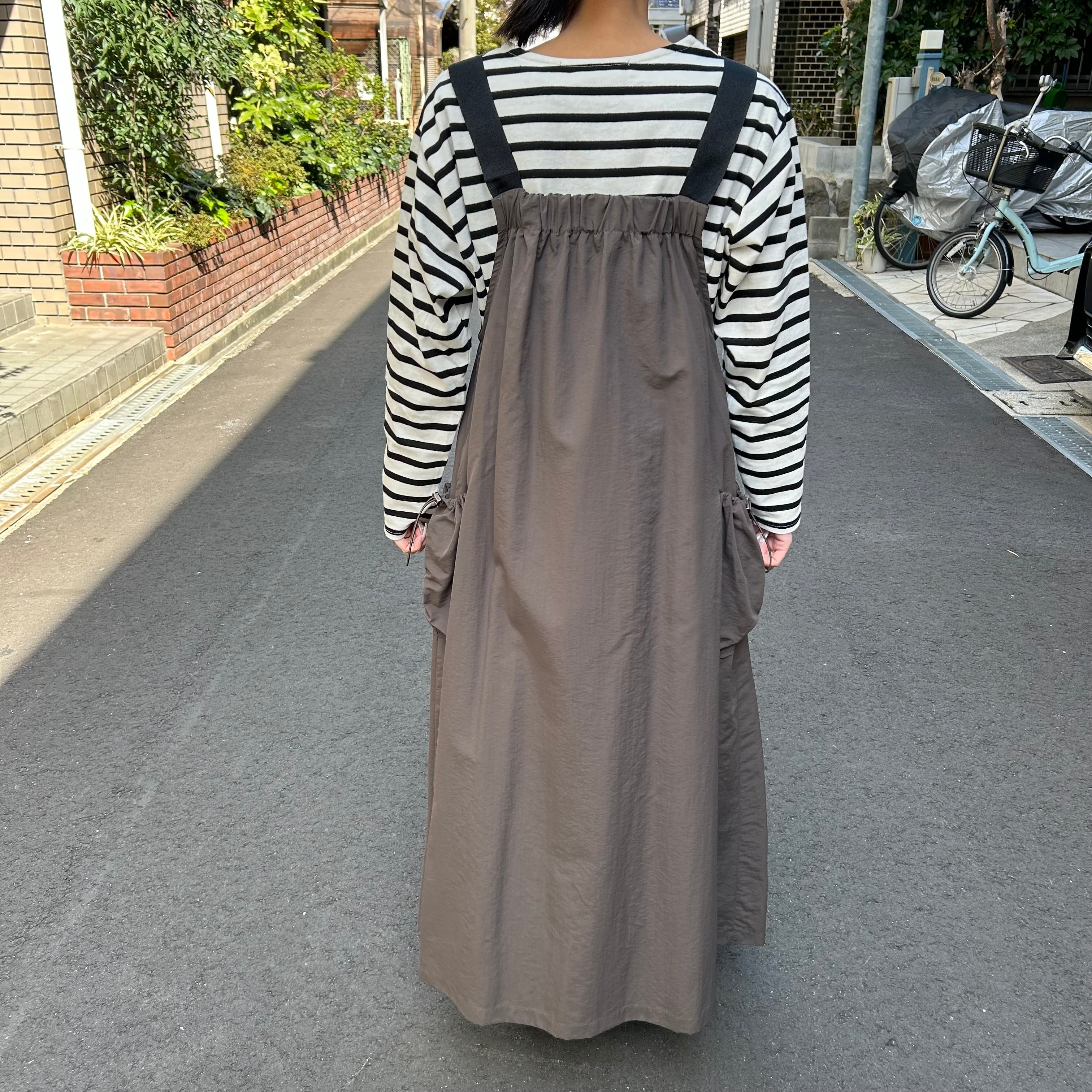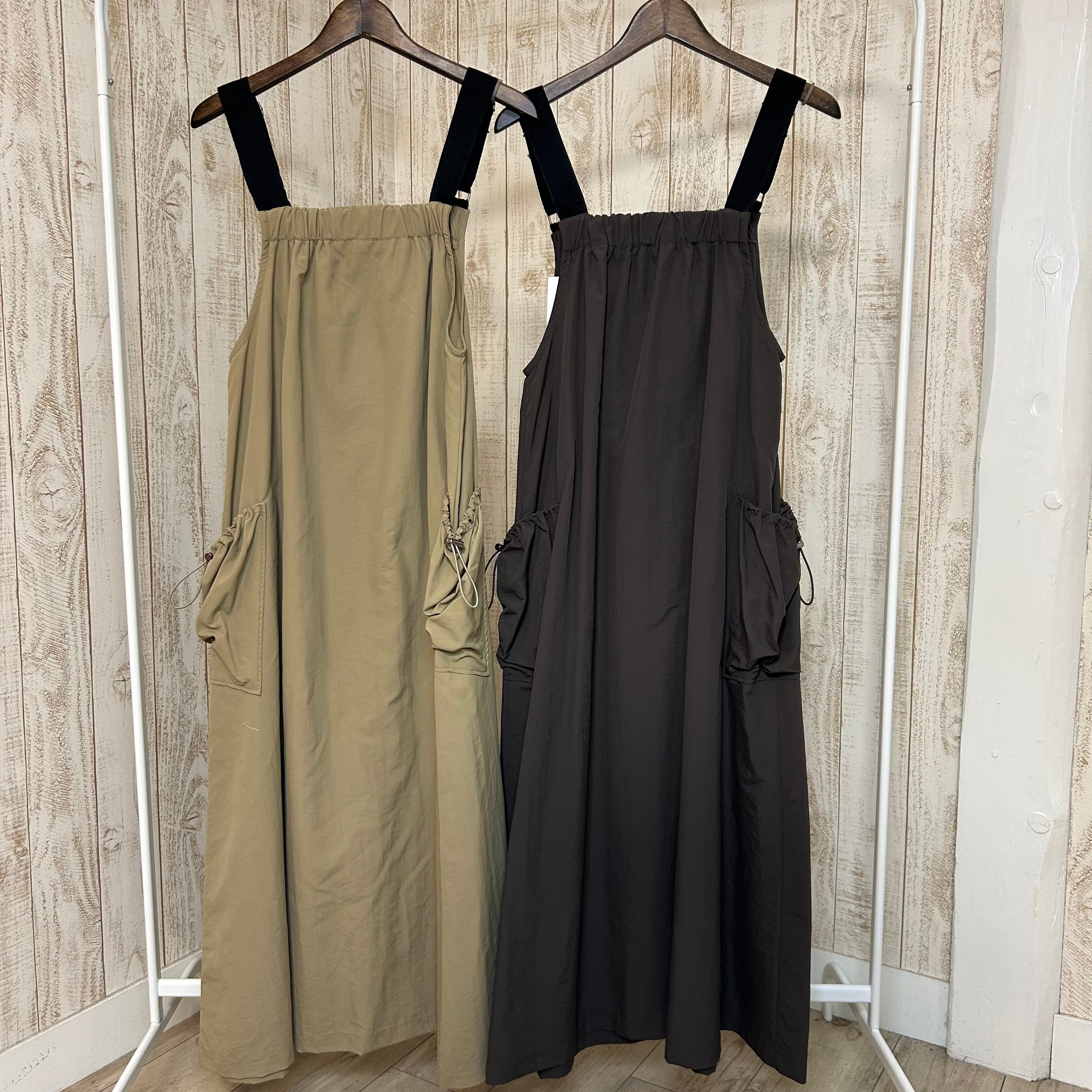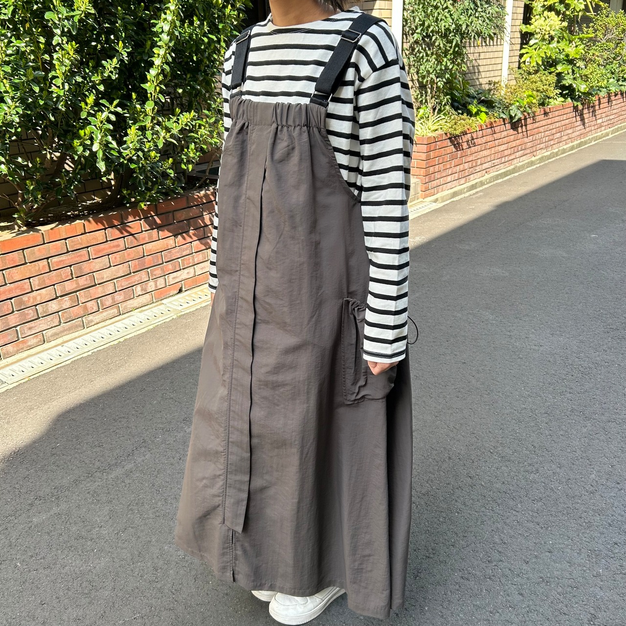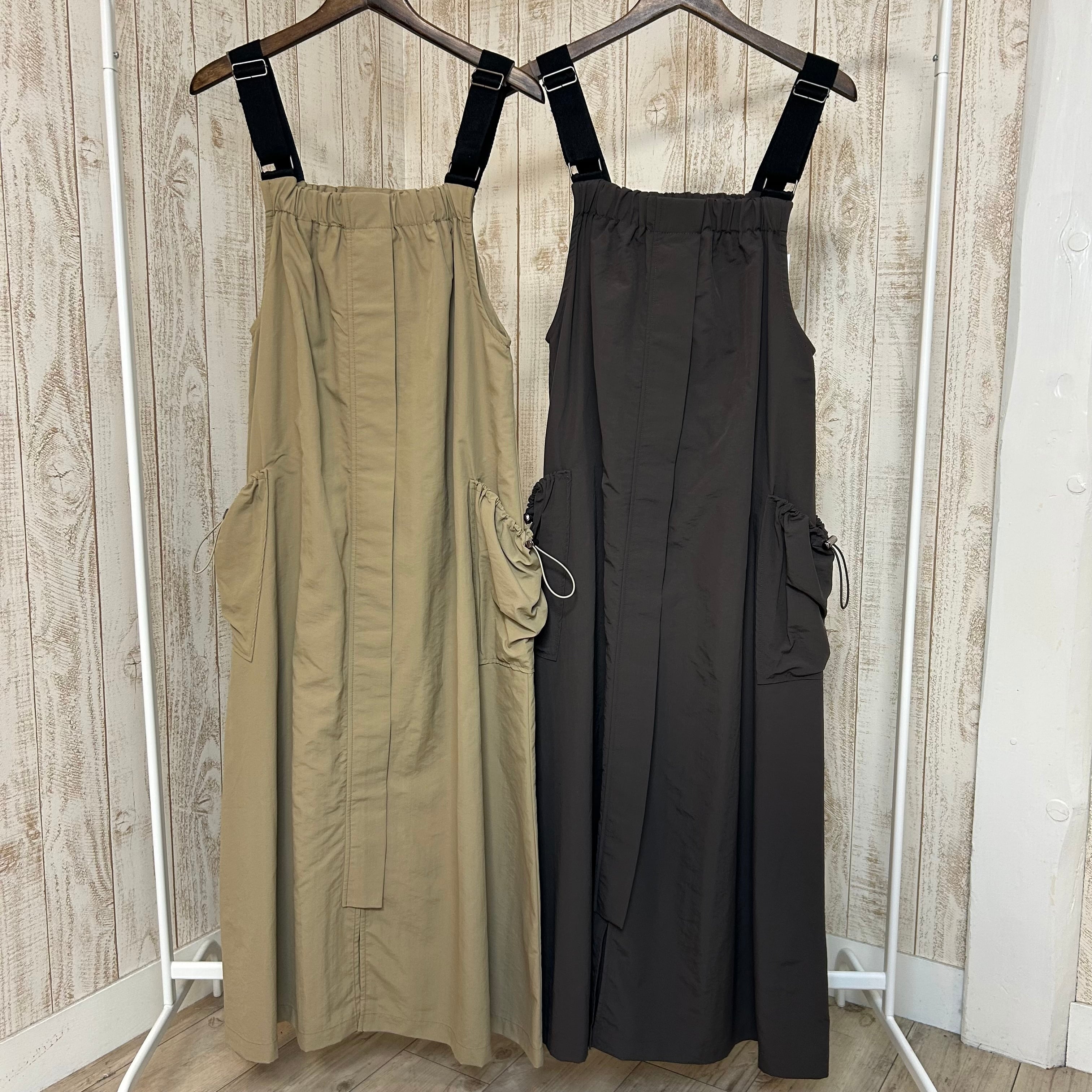 薄手のナイロン素材です。肩ベルトが配色になっています。少しキレイめに見えるジャンパースカートです。