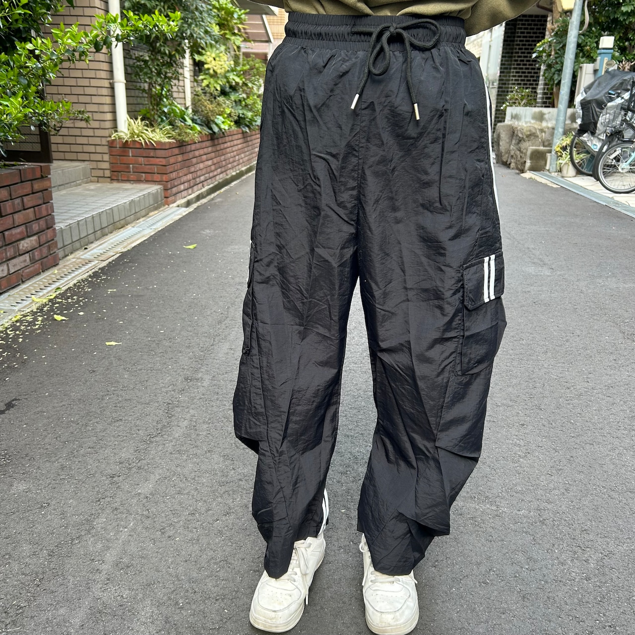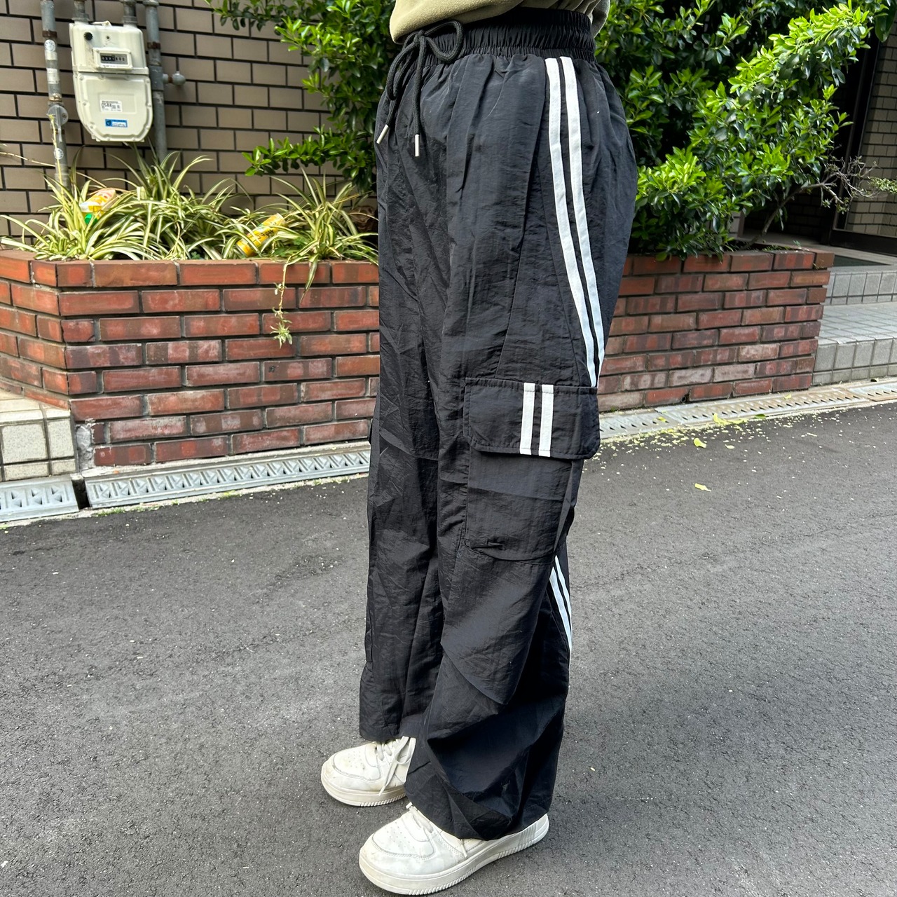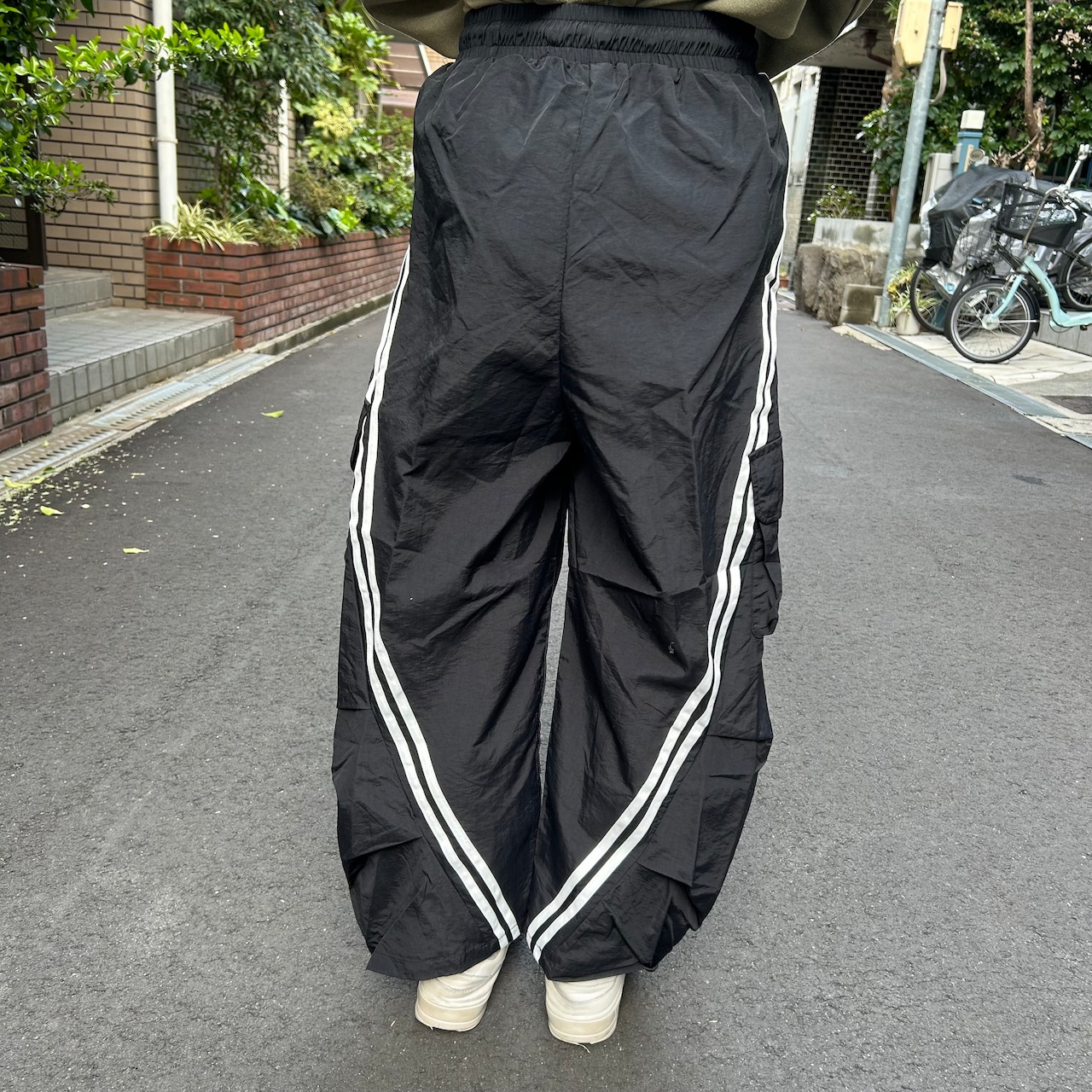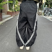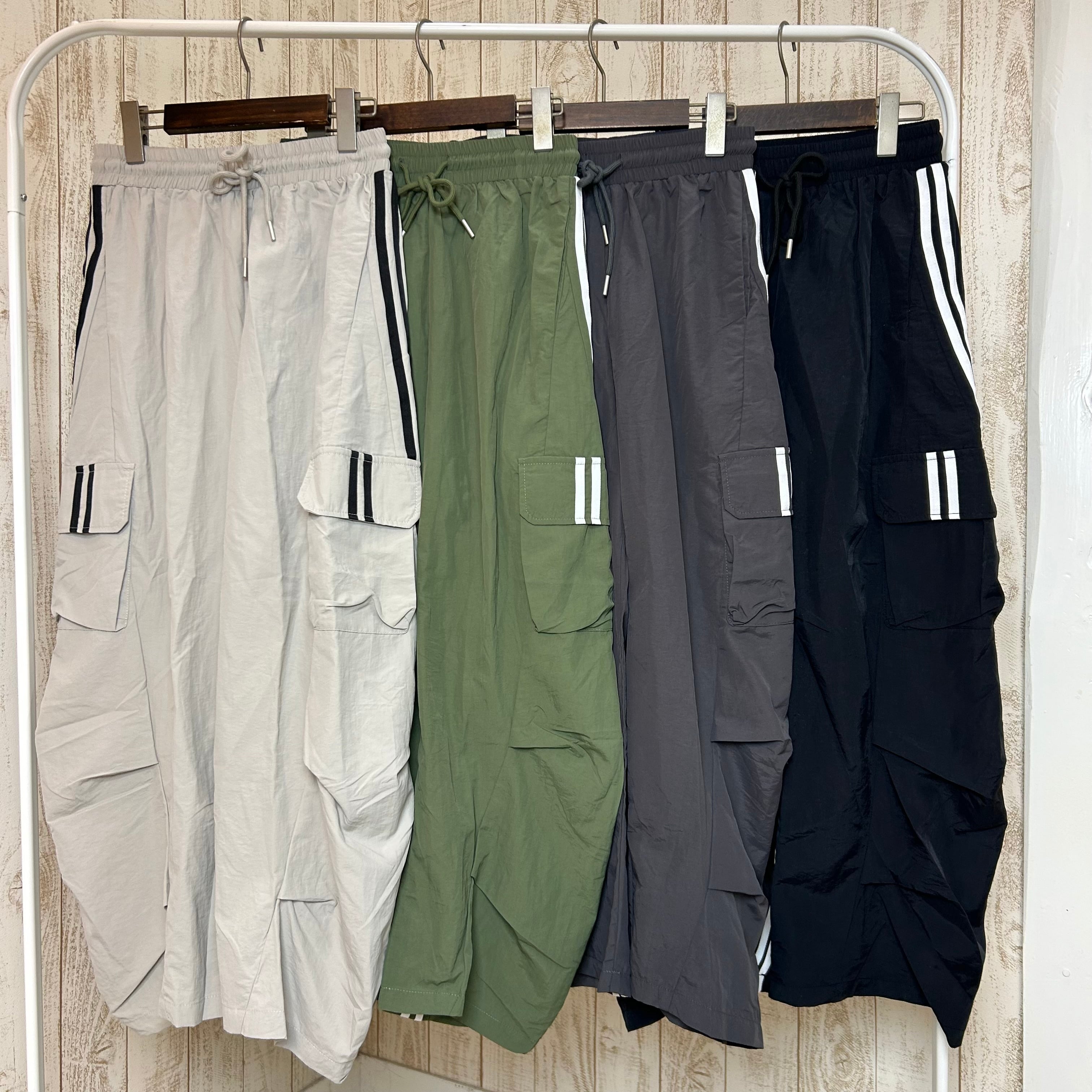 カーゴポケットのついたナイロンのライン入りパンツです。ラインが後ろに向かって曲がってるところが可愛いですね。